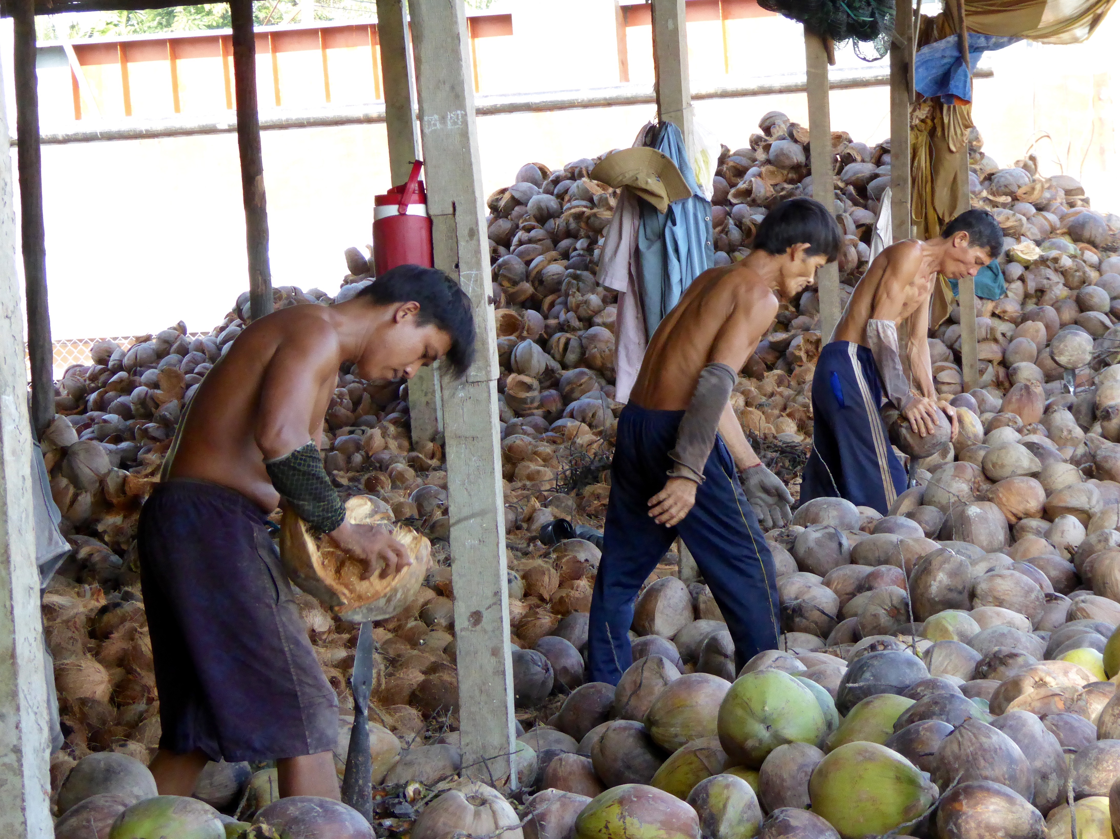 Previous Image Next Image Mekong coconut factory 3. The first job is to split the coconuts on a spike to remove the green outer pod. Dangerous and hard work.