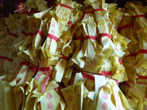 Also across the river is a famous cake shop. We saw many of the Kuching cakes – known as Layer Cakes – along the streets, but it was the shop across the river, where the layer cakes were made into Swiss rolls, and whose boxes and bags were carried by the many out of town visitors to Kuching. The cakes are crazy colours, each colour being a different flavor.  (We are told the colours are natural, but we remain skeptical.) People crossed the river, bought their cakes and returned back on the boat. We meet a couple from Singapore who were taking their supplies back home for family and friends.