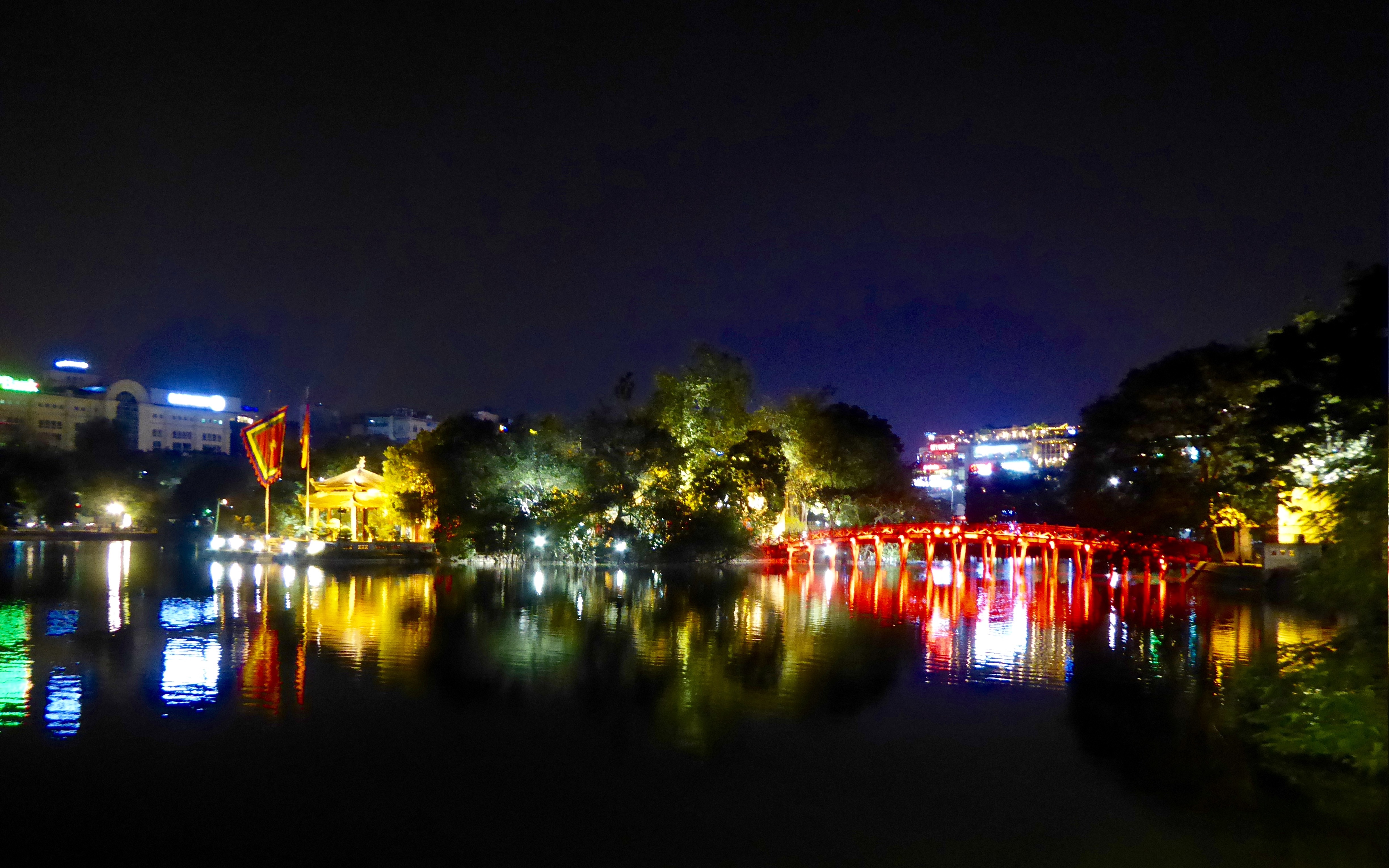 Hoan Kiem Lake at night towards Ngoc Spn Temple and Huc Bridge